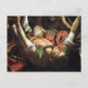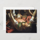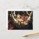 This postcard features a classical painting by famed artist Caravaggio. It was painted in the early 1600s. The title of the painting is "The Conversion of Saul." It depict a handsome, muscular young soldier on the ground, surrounded by men and horses.