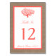 The rustic burlap effect background gives these table number cards a boho-chic feel, while the tropical coral is the perfect finishing touch for any elegant beach wedding.