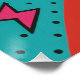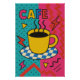 An explosion of asymmetrical shapes surrounds a cup of coffee drawn in a naive and cartoon style. The background alternates black-dotted patterns on a turquoise background and pink zigzags. The cup, bright yellow with an exaggerated cove, rests on a blue and white checkerboard saucer. Red flashes, floating triangles, and tight lines evoke the energy of caffeine. The word CAFÉ is written in colored capital letters, each in a different style, placed in a corner as a lettering collage.