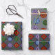 Water, fire, earth, and wind themed concentric circle mandalas come together in this colourful design. Each features a similar centre and outer layer with the others being appropriate to the element. Two sheets in this set feature the mandalas on complimentary coloured diamonds patterned across a dark grey background, while the third sheet features a pattern of mandalas scattered on a lighter grey background to give you options and variety for your gift wrapping or DIY projects.