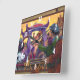 The Emperor’s New Clothes bold and colorful original art painted by our talented children’s illustrator, Traci Van Wagoner, shows the Emperor parading through town in all his new suit glory (with a curtain strategically covering his private parts) in his carriage being pulled by two beautiful horses, one black and one white. A man and his son and dog are watching with the boy pointing out that the Emperor has nothing on at all. Anyone who loves fantasy and fairy tales will love this artwork.