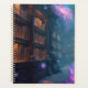 Tall shelves filled with ancient books glow in golden light, while purple crystals and floating orbs shimmer in the air.