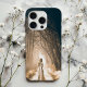 Fantasy graphic phone case features young girl on illuminated path of tall leafless trees.