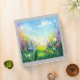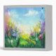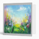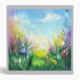 Vibrant abstract painting of a spring scene with a lush green meadow and blooming flowers in various shapes and colours. The sky is a mix of soft pastel shades with a few fluffy clouds scattered across it. The overall mood of the painting is cheerful and rejuvenating, capturing the essence of spring in its full bloom.