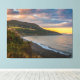 Experience the peaceful serenity of an Irish evening with this image capturing the beautiful Greystones Beach in County Wicklow, Ireland. As the sun sets, a dramatic golden and orange glow illuminates the horizon, contrasting with the moody clouds and dark headland known as Bray Head in the distance. The calm water reflects the vibrant sky, creating a tranquil scene along the pebble and sand coastline that offers a perfect, scenic escape from nearby Dublin.