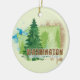 Washington State outline with a splash of blue water and evergreen trees on a pale spring green background. Background colour can be changed.