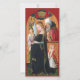In this early 15th-century arched panel painting by an anonymous French artist, the birth of the infant Jesus is imminent. Beneath a golden crown being lowered from heaven on high and supported by two bright red angels, another, a larger, smiling angel with multi-colored, upright wings and dressed in white, gently leads a gravid—that is, very pregnant—Virgin Mary to the place where she will deliver her babe, fulfilling the first part of God’s plan for the salvation of mankind. Mary, dressed in a dark blue robe and matching mantle, her head humbly bowed, meekly follows the angel’s lead. She is serenely calm and introspective. In the hand not held by the angel, she carries a medieval bag book, probably a book of Scripture. Two much smaller female figures wearing aprons follow after the BVM. They are neither angels nor children. They are "Emea" (the midwife") and Salome who attended Mary in the Nativity story as recounted in the apocryphal Gospel of James. Their small stature indicates their lesser importance in the scene. Behind an elaborately woven, waist-high tapestry hung as a privacy curtain, a fretful, elderly St. Joseph watches as his young wife is led away to give birth. + Image Credit (Front): The Expectant Madonna with Saint Joseph, by an anonymous 15th-century French painter, c. 1425/1450, tempera on a European walnut panel. Dimensions (image): 27 3/4 × 13 3/4 in. (70.5 × 35 cm.); (with integral frame [not pictured here]): 32 11/16 × 19 × 2 3/4 in. (83 × 48.3 × 7 cm.). The Samuel H. Kress Collection, The National Gallery of Art, Washington DC, Accession Number: 1952.5.32. This image is in the public domain. + Image Credit (Back): Adaptation of berries from OpenClipart-Vectors via Pixabay.