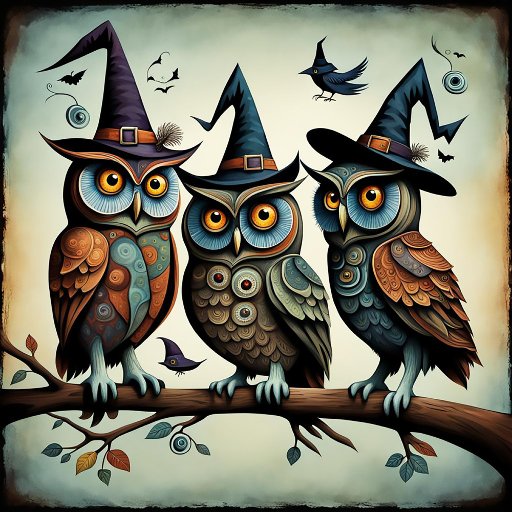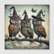 Scary but cute. A trio of owls wearing witch's hats; surreal style, an artificial-intelligence generated artwork, on a magnetic card for your Halloween pleasure. So seasonal! So stylish on your fridge!
