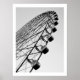 A black and white photograph of the elegant curves and lines of a Ferris Wheel.