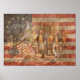Betsy Ross flag superimposed over The Birth of Old Glory, by Moran. Betsy Ross presenting the first American flag to George Washington.