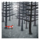 A wild red fox stands among trees in a dark forest. A landscape painting for animal, nature and wildlife lovers.