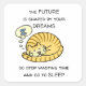 A cute cartoon cat sleeping with the funny saying "The future is shaped by your dreams, so stop wasting time and go to sleep". The text is customizable