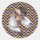 Stylish design features watercolor illustration of an Airedale dog in profile wearing a suit and top hat on black and gold chevron striped background