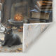 Nestled in a rustic room where autumn leaves drift past the window, a ghostly figure sits quietly by the fire, wrapped in a white sheet and soft silence. The stone hearth glows with candlelight and warmth, casting flickers across aged books, framed memories, and a single carved pumpkin. A black cat with glowing eyes watches from the shadows, its gaze steady and knowing. The air hums with the hush of October—where comfort and mystery curl together like smoke.