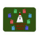 This awesome magnet features a cute Christmas ghost with black eyes and mouth wide open. The ghost is wearing a festive red and white hat with a pompom on the top. There are sparkly red, blue and green presents surrounding the ghost. A message in festive red text below the ghost says "The Ghost of Christmas Presents" in bold capital letters. This funny festive design is suitable for all ages.