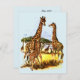 This illustration is of a family of giraffes in the brush. A few trees and lots of grass. The sky is a light blue with clouds. A white backround is added. This design is featured on assorted styles and sizes of cards. Also has a matching envelope..