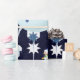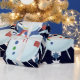 This design features a white and blue snowflake, coloured snowflakes and lots of snowmen dressed for a cold Christmas season. A glitter was added to this design. This Christmas gift wrap comes in assortment of colours, styles and sizes.