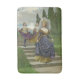 This design features a painting by the British Pre-Raphaelite artist John Collier (1850–1934). It shows a wealthy lady wearing an elegant dress in a medieval setting. Perhaps she is a princess or a noblewoman. The long train of fabric attached to the lady's dress is being carried by two young boys, who are also part of the aristocratic court. The lady is walking down some stone steps in a graceful and refined manner. There are manicured lawns of grass on either side of her. There are also some tall conifer fir trees. The sky is blue with some white clouds, and there are mountains in the distance. The costume that the lady is wearing is blue and gold, and she has an elaborate headdress in a style that was fashionable in the European Middle Ages. The lady's dress is dark blue with a golden fleur-de-lis pattern. The original artwork was painted by John Collier in 1920.