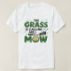 This vibrant and playful image features the phrase "The Grass is Calling and I Must Mow" in bold, colourful letters. The word "GRASS" is prominently displayed in large green letters adorned with flowers and butterflies, while the word "MOW" is decorated with a cheerful sun and blades of grass.