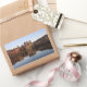 Rectangular photo sticker with the modern skyline of the city centre of The Hague together with historic Mauritshuis museum and the seat of government Parliament building with reflection in the still water of Hofvijver lake at dusk in The Netherlands.
