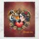 The heart of the hidden wilderness, a majestic tiger, and the profile of a woman are artfully blended. Both motifs are embedded in an elegant, heart-shaped frame, underscoring the romantic mood. The frame is richly decorated with delicate floral patterns that harmoniously wind around it, lending it a playful, imaginative touch. Amidst the flowers is a bright red heart, symbolizing love and passion.