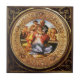 The Doni Tondo or Doni Madonna, Renaissance fine art ,masterpiece by Italian Renaissance master Michelangelo Buonarroti in its original frame.The frame is ornately carved and rather unusual for the five heads it contains which protrude three-dimensionally into space.Located in the Uffizi in Florence, Italy, in bright yellow,white,blue,red,green,brown colours.