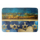 The artwork features a mixed-media design. The upper section displays an oil painting illustration of Jerusalem in Israel at night, separated by a golden ribbon. The lower section includes illustrations in blue hues of hearts and golden stars, referencing the star of David. The overall composition is characterized by elegance and sophistication. Whether using it during Chanukah or for the love of Jerusalem and the Holy Land of Israel any time of the year, this will be a great addition to any decor.
