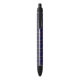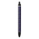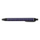 The image displays a pen with a black tip and clicker. The barrel is covered in a dark purple, textured pattern featuring small, colorful dots. The pen is shown from both front and bottom views against a white background, highlighting its design.