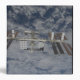 The International Space Station, backdropped by a blue and white Earth.