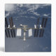 The International Space Station backdropped by a blue and white Earth.