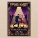• This elegant digital illustration features a couple dancing under a spotlight, highlighting an Art Deco-style vintage poster for a 1940s swing night event.