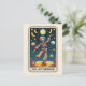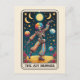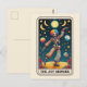 Spread good cheer and celebration with 'The Joy Bringer' Tarot-inspired art postcard. This incredibly unique illustration features a dancing skeleton wearing a bold, rainbow clown suit against a vivid, starry night sky.