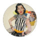 Artist:Mike Ludlow | Woman in black & white striped dress looks back at man on couch