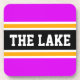 This sporty, colourful design features athletic THE LAKE text inside a highlighted wide black stripe with white and yellow pinstripes against bright pink outer stripes. The text and colours in this design can be personalized.