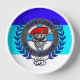 The skull and circle design is colored in blue and gray in a casual style.