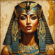 "The Legendary Cleopatra VII". This artistic stylized painting of Cleopatra VII brings out her distinctive facial features: a prominent nose, almond eyes, and a strong chin. Her braided hair, adorned with blue precious stone and gold, is topped with a golden diadem in the shape of a vulture which symbolised purity and motherhood, and also the eternal cycle of death and rebirth. The painting’s rich colour palette and intricate details capture her regal essence and intellectual charm.