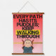 A motivational tapestry design featuring the quote, "Every path has its puddle; keep walking through." The artwork blends an inspiring message with a visually striking scene of a misty pathway, where puddles reflect a golden sunrise, symbolizing resilience and perseverance. The typography is elegantly hand-brushed with a modern touch, harmonizing with a serene color palette of blues, grays, and warm golds. Perfect for adding a touch of inspiration to any space—ideal for home décor, offices, or meditation rooms.