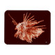 Colourized pencil sketch: Red lionfish are clad in white stripes alternated with red, maroon, or brown. Adults can grow as large as 17 inches (43 cm) in length while juveniles may be shorter than 1 inch (2.5 cm). They can live up to 10 years. The fish has large venomous spines that protrude from the body like a mane, giving it the common name of the lionfish.