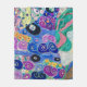 A kaleidoscope of colours forms swirling patterns and floral motifs, creating a lively visual tapestry. The use of bold blues, purples, and greens combines with striking pinks and yellows to evoke an intricate, whimsical feel. The artwork's complexity and vivid colours suggest a playful yet sophisticated design.