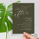 Mark the beginning of your forever and thanks to your bridesmaids, groomsmen and others, with elegance using our contemporary themed post wedding brunch celebration invitation card, "The Morning After" in olive green. Perfect for couples extending their joyous occasion, this invitation exudes sophistication with a hint of playfulness, setting the stage for a memorable event. Adorned with a timeless modern script design theme, it adds a touch of refined charm to your festivities. Crafted by TeeshaDerrick, this invitation promises to beautifully capture your love story.