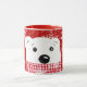 Polar bear muzzle in a red plaid scarf on a red background with white snowflakes.