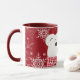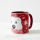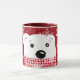 Polar bear muzzle in a red plaid scarf on a red background with white snowflakes.