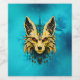 The mystical fox head, noble and mysterious. The design features a stylized fox head, artfully framed by delicate ornamentation. The fox is predominantly rendered in an elegant gold tone, giving it a noble and mystical aura. Black accents emphasize the contours and details of the fox, highlighting its form and expressiveness. The piercing red eyes create an intense contrast and give the fox a piercing, almost hypnotic gaze.