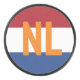 The flag of the Netherlands with the country abbreviation superimposed in orange.