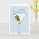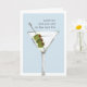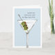 Sarcastic birthday card features a watercolor martini cocktail illustration on a blue-grey background with "however old you are is the new 30" in vintage typewriter lettering. Customize the inside message or leave as-is; default message reads "cheers to you -- happy birthday."
