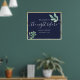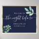 Elegant, modern, botanical, simple gold and navy blue The Night Before rehearsal dinner welcome poster with handwritten calligraphy script.
