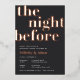 Modern rehearsal dinner invitations feature chic black and white styling with "the night before" in oversized rose gold foil retro lettering. Personalize with your ceremony rehearsal and dinner celebration details beneath.
