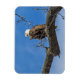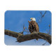 The bald eagle strikes a pose standing on a tree limb against a bright blue sky.
