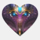 The alien portrait has piercing blue eyes, with a metallic gold brow structure, an ornamental violet blue head structure and deep rose facial flaring on either side of its face.
