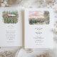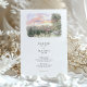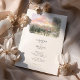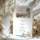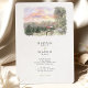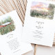 This two-sided wedding invitation features a charming watercolor illustration of a The Pallet Barn nestled in lush Christmas trees. Loose ink outlines define the wooden structure, while soft washes of evergreen, sepia, and muted gold capture the texture of the trees and the surrounding landscape. On the front, a scenic country lane lined with fencing leads the eye toward the barn under a dreamy pastel sunset sky, creating a romantic sense of arrival and place.